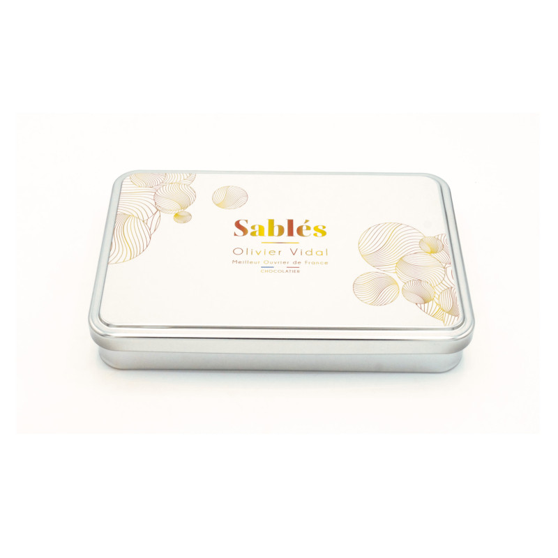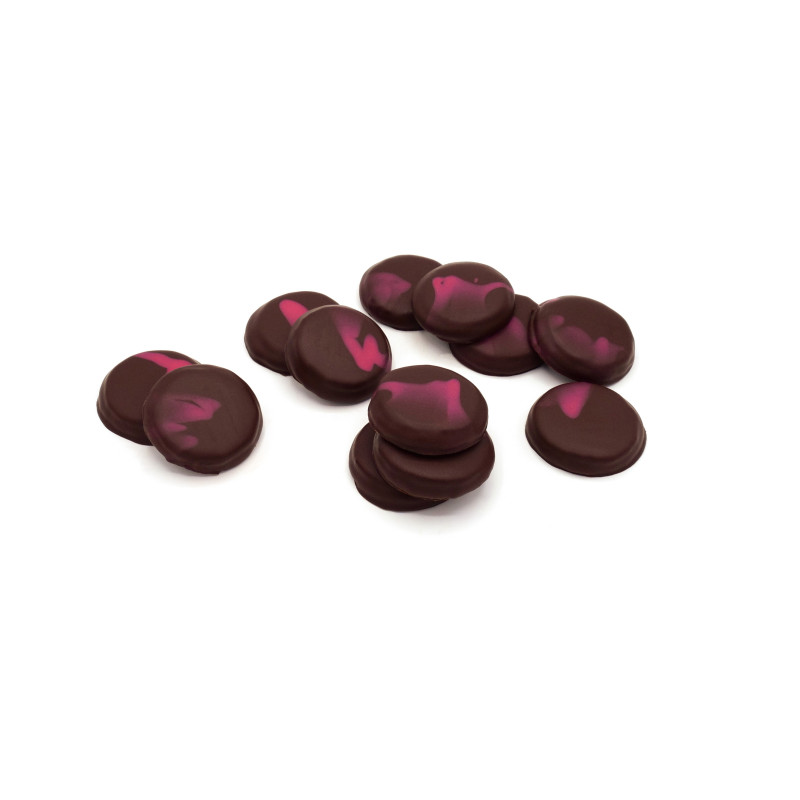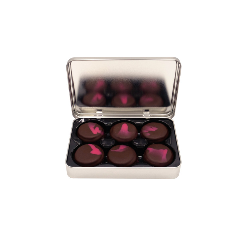 Boîte de sablés bretons et confit de framboise, enrobage chocolat noir grand cru 60%