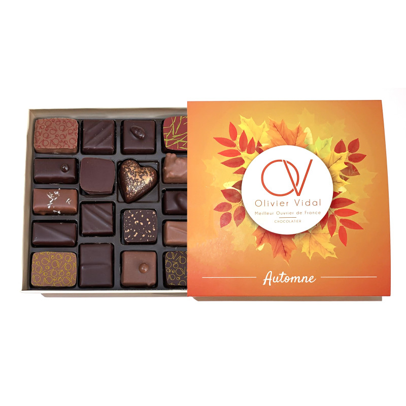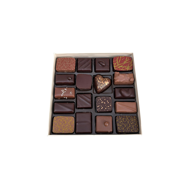 Pâte de cacao, beurre de cacao, poudre de lait, lait, crème fraiche, beurre, noisette du piémont, amande de Provence et Valence, arachide, noix de cajou, pignon de pin, sucre, sirop de glucose, sucre inverti, sorbitol, café, miel, jus de yuzu, pulpe de mûre, pulpe de framboise, pulpe de fraise, pulpe de rhubarbe, vanille gousse, badiane, thé vert, thé noir fumé, citronnelle, jus et zeste citron vert, jus et zeste pamplemousse, gingembre, jaune d'œuf, fève de tonka, spéculoos, pectine, clémentine, mandarine, crêpe dentelle, riz soufflé, fleur de sel, lécithine de soja, arômes naturels, huiles essentielles, fenouil, feuilles de combawa. Colorants décors : E100, E102, E110, E124, E129, E132, E133, E171