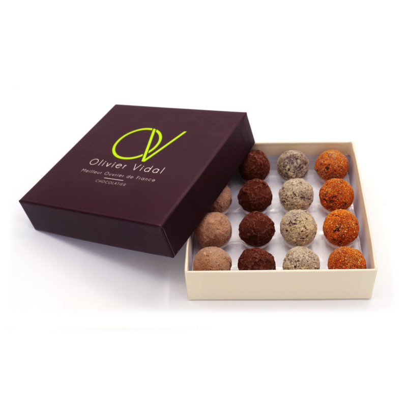 16 truffes aux 4 saveurs de Noël : truffe ganache chocolat noir ; truffe caramel vanille Bourbon et beurre salé ; truffe gianduja, noisette du Piémont et épices de Noël ; truffe au confit de clémentine de Corse.