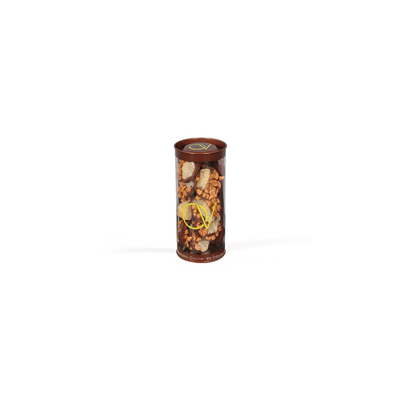 Chocolat au lait 38 % garni de poires déshydratées et d’éclats de céréales caramélisées