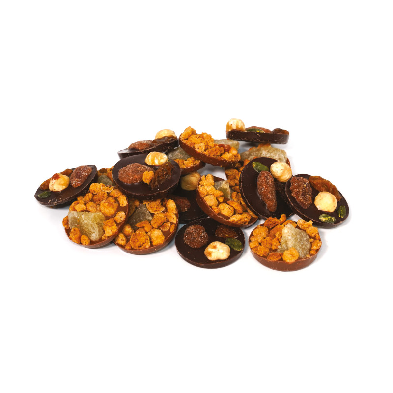 Palets de chocolat noir (Equateur 72 %) garni d’amandes Marcona caramélisées, de noisettes du Piémont torréfiées, de pistaches vertes et de raisin sec Jumbo