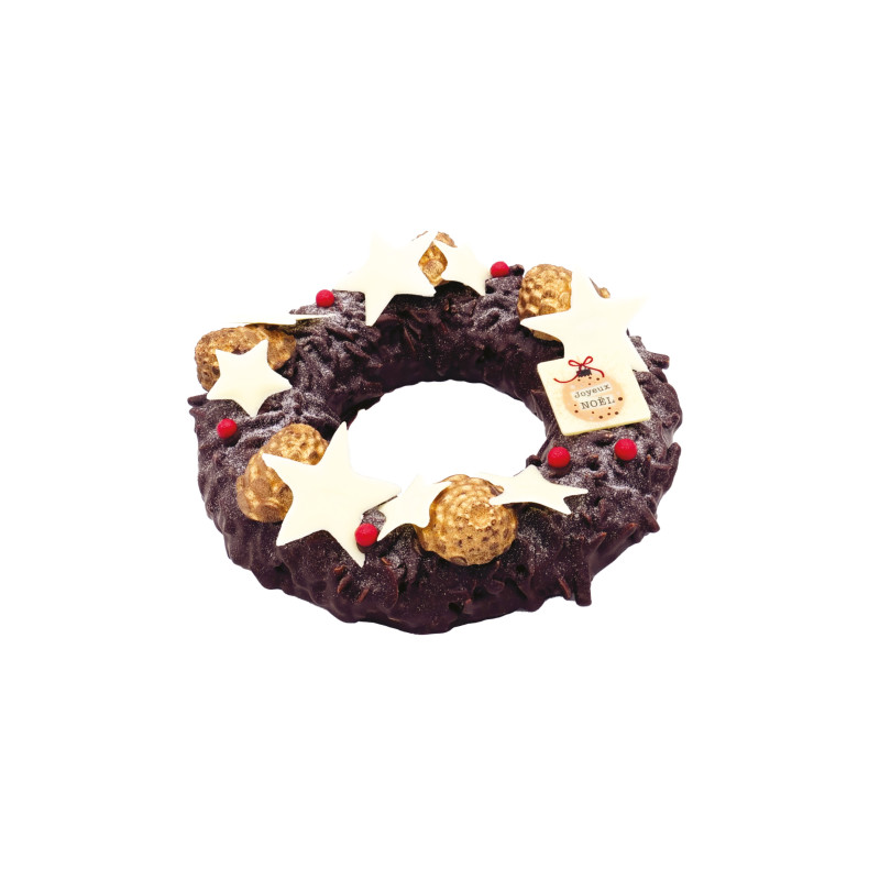 Couronne de Noël traditionnelle garnie d'un praliné noisette du Piémont, de riz soufflé caramélisé, d'un sablé noisette et de crêpe dentelle.