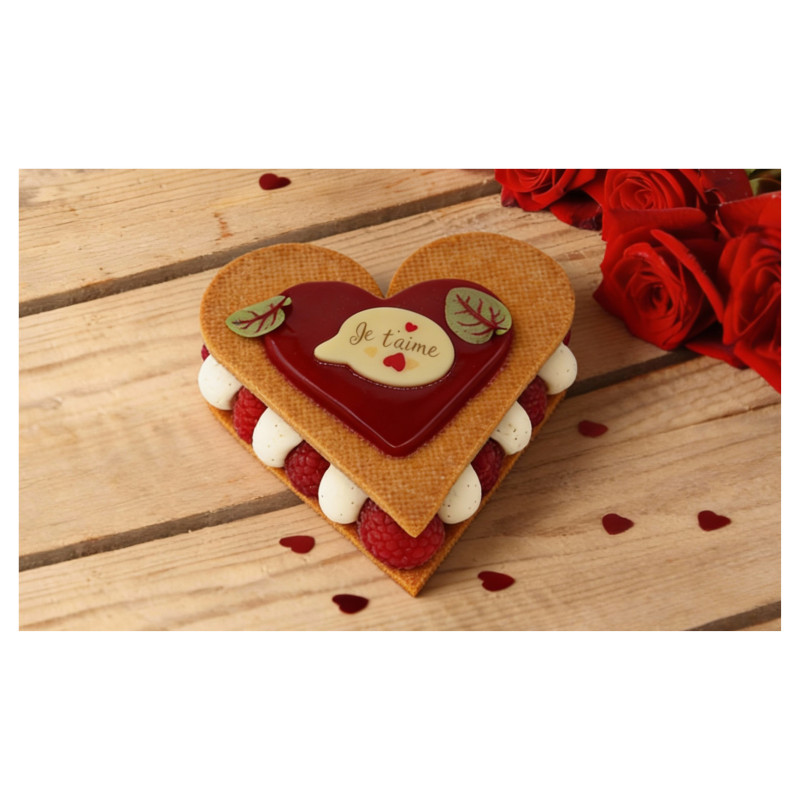 Entremets composé d'un sablé breton, de framboises fraîches, d'une mousse légère vanille et d'un confit de framboise Timut.Disponible en retrait boutique uniquement, le samedi 14 février.